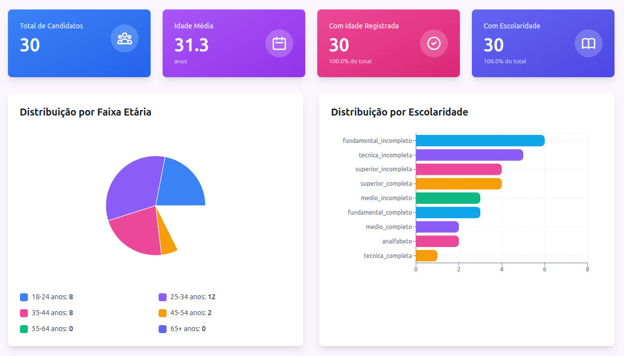 - Quebra da base de candidatos por gênero, PCD, situação profissional, etc.