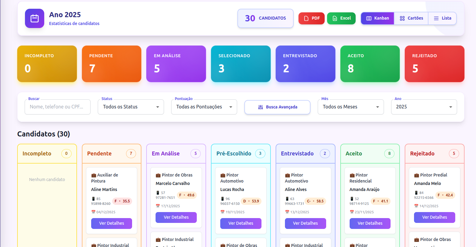 Contadores por status (pendentes, em análise, entrevistados, aceitos, etc.)