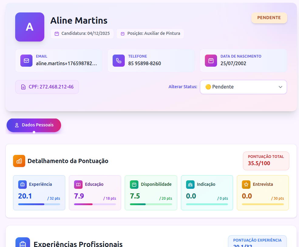 No frontend, desenvolvi um painel em React + TypeScript focado na produtividade do recrutador: