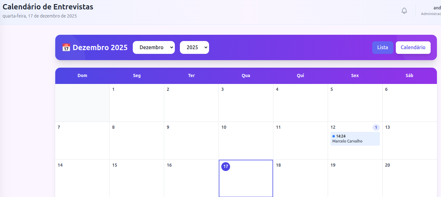 - Criação, atualização, reagendamento e cancelamento de entrevistas
